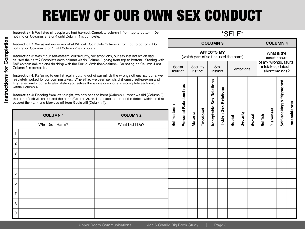 One of the key components of Joe and Charlie’s Big Book Study is the printable fourth step worksheet. This worksheet is designed to help individuals take an honest and thorough inventory of themselves as part of their recovery journey.