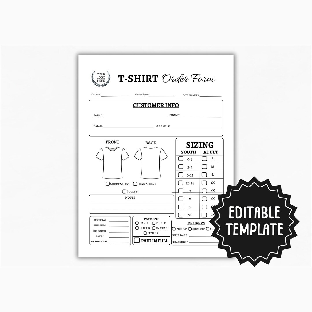T shirt Order Form Template Customizable Order Form Printable Etsy